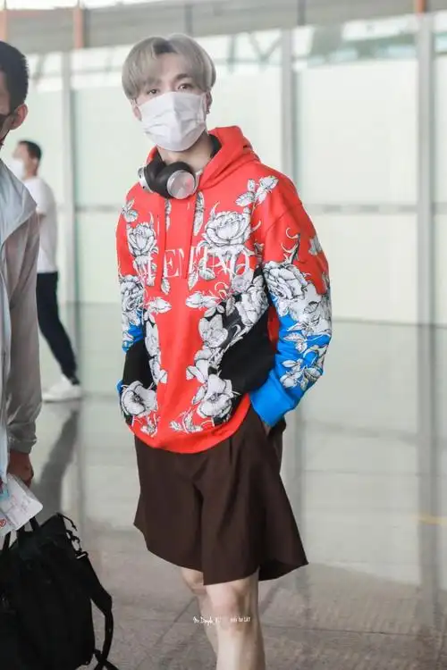 原创张艺兴新发色现身机场红色印花卫衣配短裤耳机挂在脖子上好潮