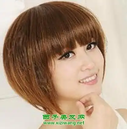 亚光色的染发,蓬松感十足的玉米烫发型,直发内扣的斜刘海,很俏丽活泼