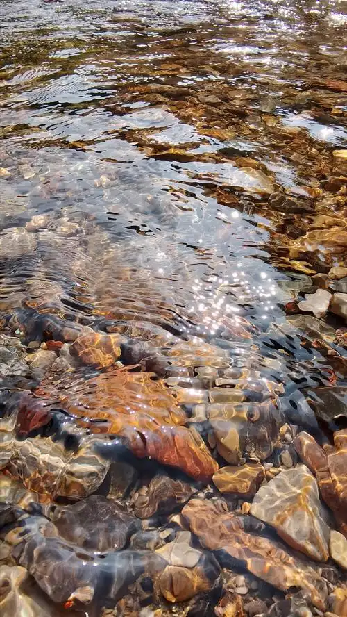 小河流水,河水清澈见底,顺流而下.
