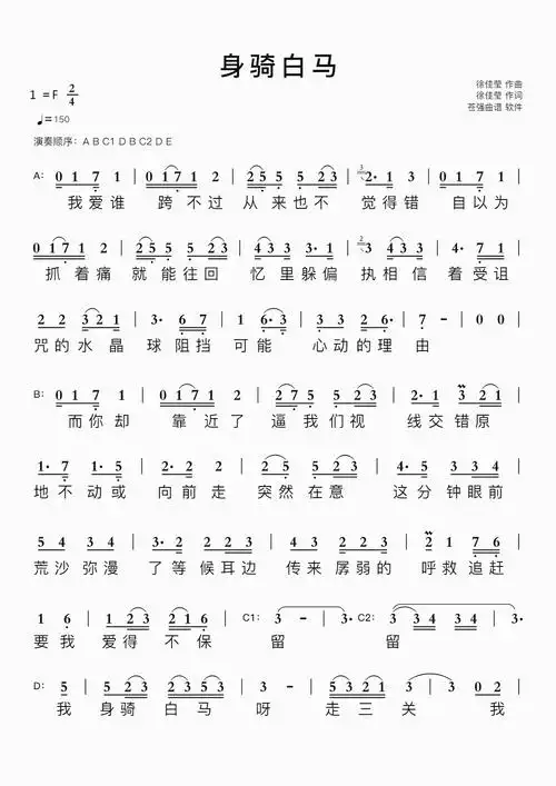 身骑白马 徐佳莹 歌谱 简谱