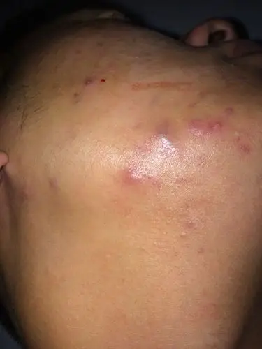 急求诊:朋友皮肤上长有象暗疮样的小红点,后变成溃烂状皮肤疮,周有
