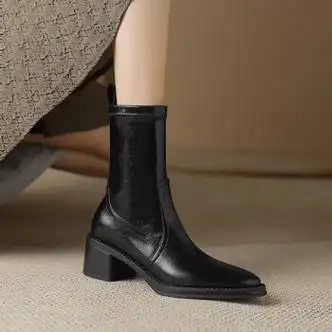 法式高跟短靴女方头英伦风磨砂翻皮马丁靴真皮粗跟黑色加绒瘦瘦靴