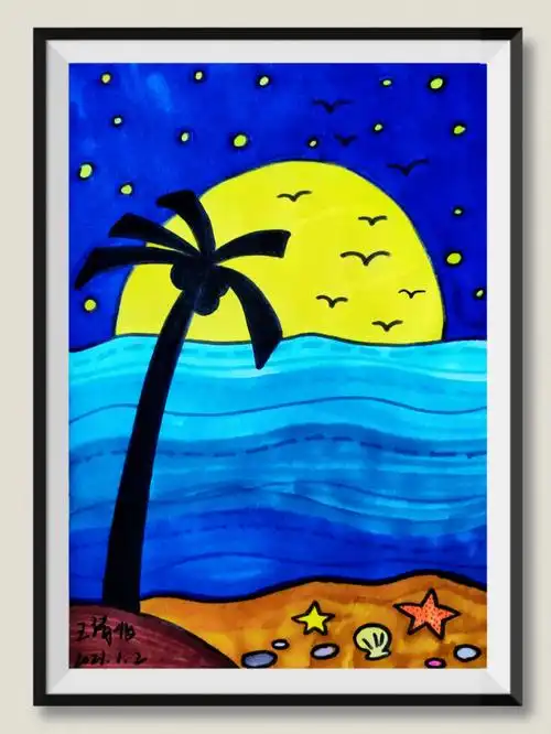 夏天主题画——《夏日海滩》风景画,简单好看! 炎热的夏天,最 - 抖音