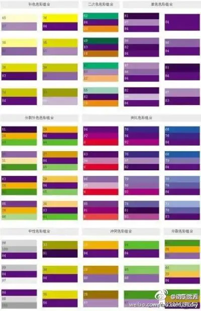 对比色:黄色与紫色互为对比色,红色与绿色互为对比色,蓝色与橙色互为