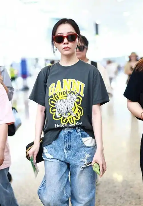 张靓颖素颜走机场,穿白色t恤搭格纹阔腿裤,活力清新哪像35岁?