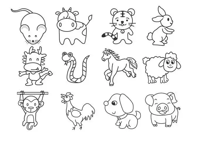 卡通鼠牛虎兔龙蛇马羊猴十二生肖形象儿童简笔画线稿涂色素材