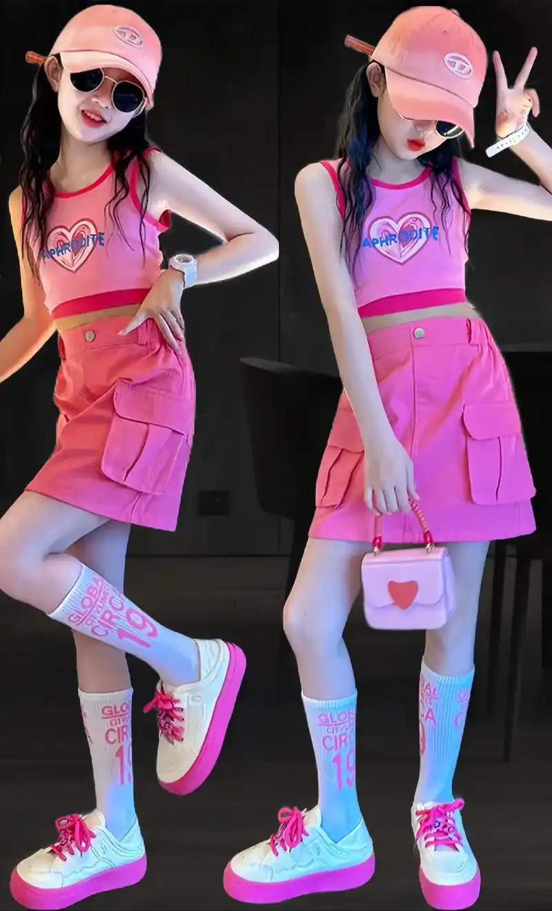 新款粉色短袖上衣高腰阔腿短裤套装.