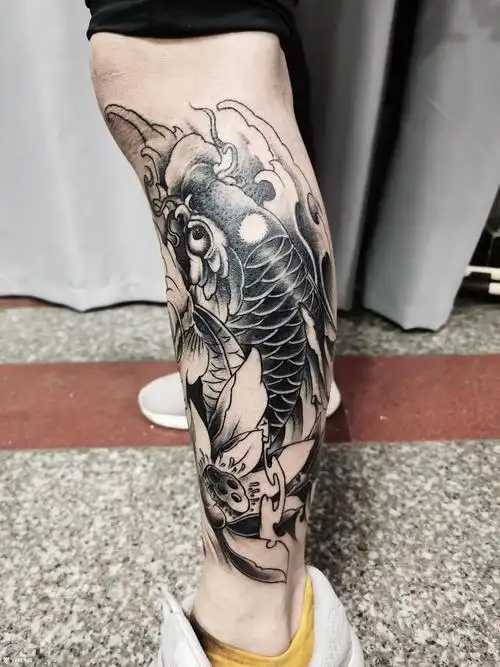 大臂传统鲤鱼莲花彩绘纹身火红的颜色,小腿红色锦鲤纹身图案转运神器