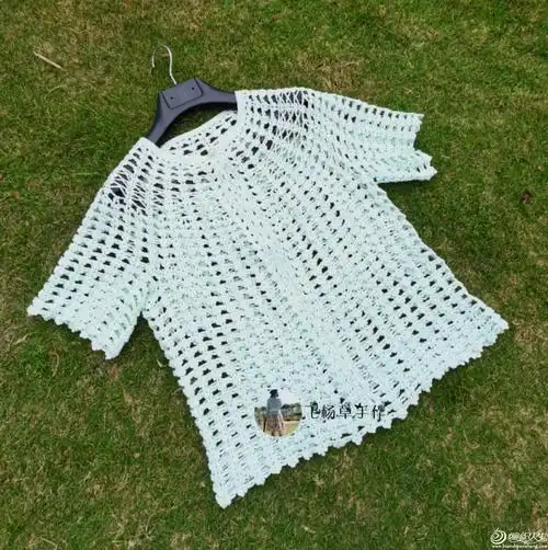 从领口开始钩的浅蓝色钩织结合园肩套衫-编织教程-编织人生