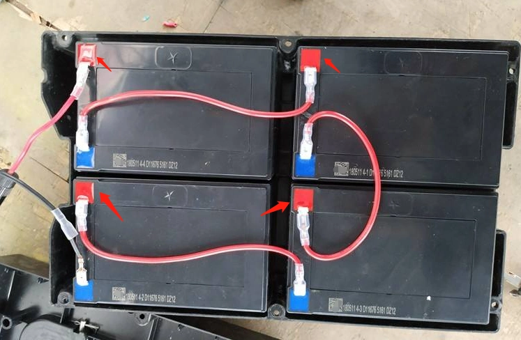 比如将四只12v250ah电瓶串联,得到的电压是12v×4=48v.