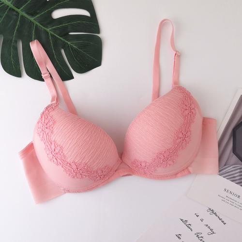 浪漫粉色女士蕾丝深v胸罩刺绣花朵性感聚拢内衣小胸调整文胸套装