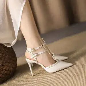 白色高跟鞋女小众气质2022春夏季新款珍珠一字带扣单鞋女细跟尖头