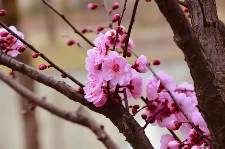 经过正常修剪的美人梅,最多一株可开花450朵,花开浅紫花色浓而不艳,冷