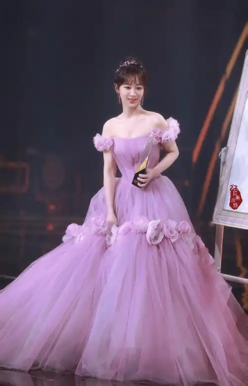 礼服裙摆齐地,显得十分优雅.头发扎起来后,杨紫还留着刘海修饰