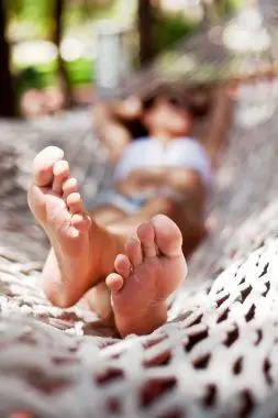 女孩轻松海滩日光浴浴床上的女人的脚特写