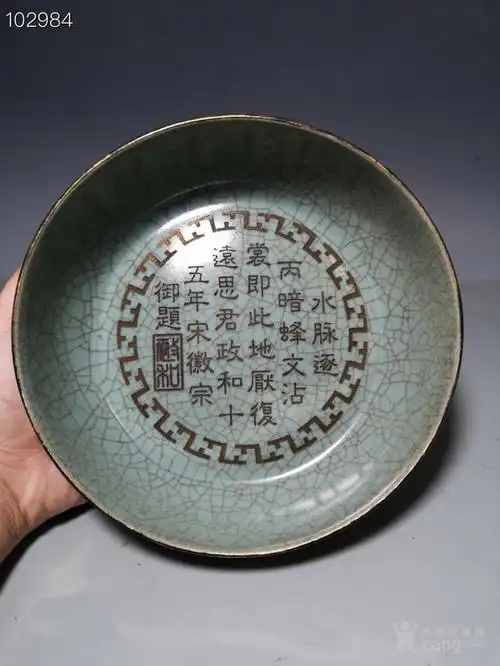 宋汝瓷宋徽宗御题铭文描金包铜口瓜棱花口碗古玩古董古瓷器