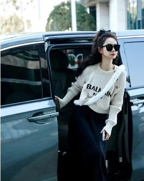 戚薇穿搭时尚现身机场 紫色外套配工装裤酷拽随性_黑色_造型_高领