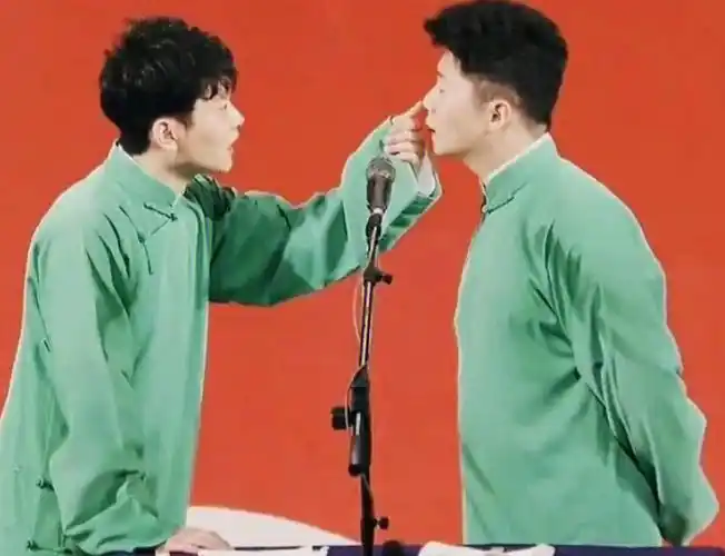 "趁着节目的空档,孟鹤堂找到了正坐在角落的周九良,同色的大褂挨在一