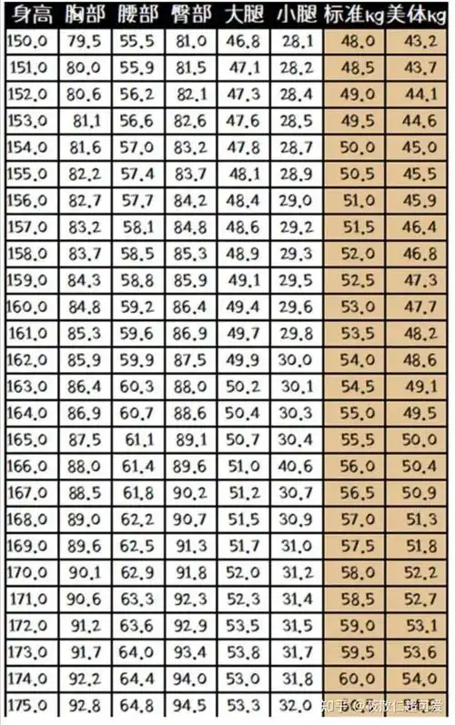 女生标准身材对照表