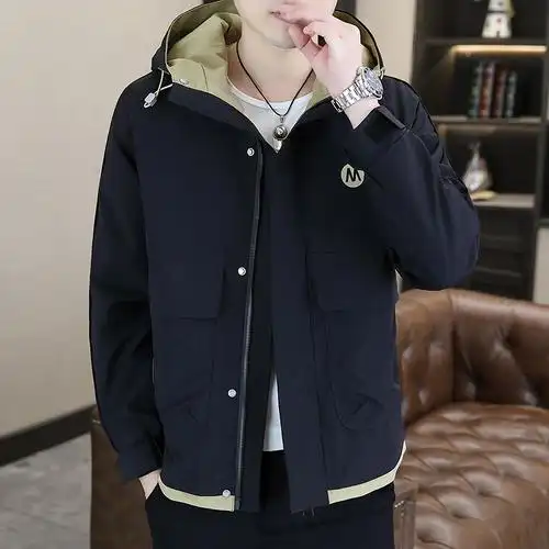 24春装新款男士连帽夹克修身休闲薄款青少年外套印花夹克衫上衣