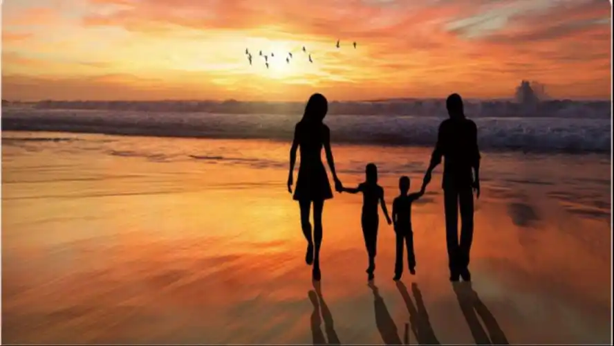 一家人四口海边看日出日落背影幸福家庭图片
