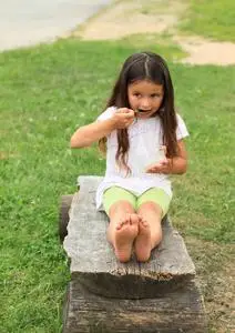 带着棒棒糖的赤脚小女孩