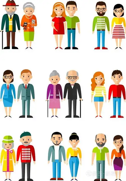 卡通风格的不同年龄年轻人和老年人与男婴女孩孕妇照片