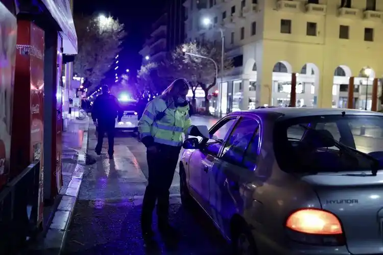 11月7日,在希腊雅典,一名警察拦停车辆检查出行许可.
