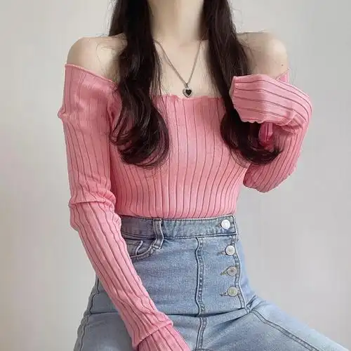露肩一字肩上衣女生露脐装女式夏季穿的气质款辣妹短款针织t恤半截