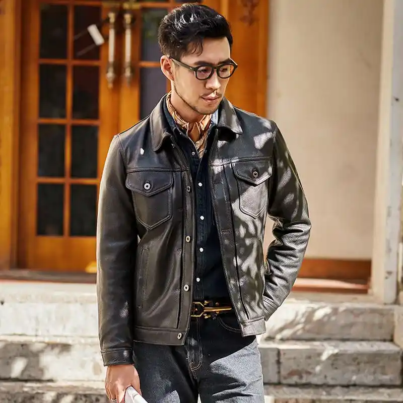 外套短款翻领修身皮夹克男潮韩版复古新款高端进口真水洗皮衣男士