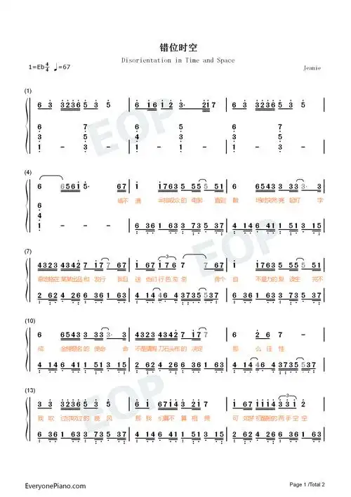 时空完美版双手数字简谱钢琴谱带歌词pdf5页错位时空钢琴谱,附简谱,很