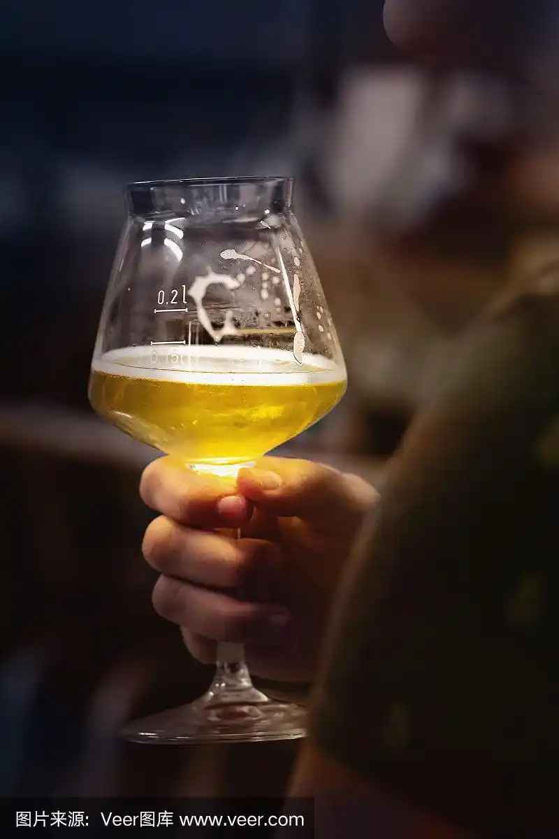 一个女人拿着一大杯淡冷的啤酒.与朋友见面照片