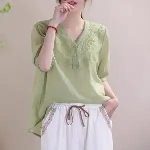 棉麻t恤女韩版显瘦女装复古民族风棉麻上衣短袖刺绣棉麻t恤女夏季薄款