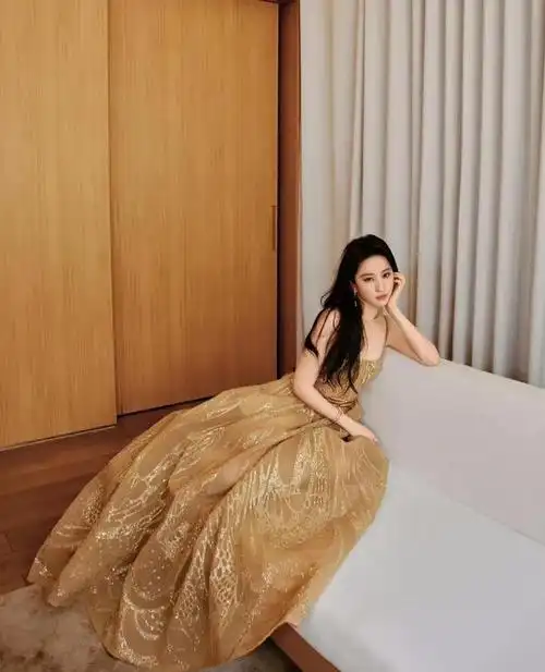 刘亦菲最新出席活动,吊带金色长裙,仙气十足,235期