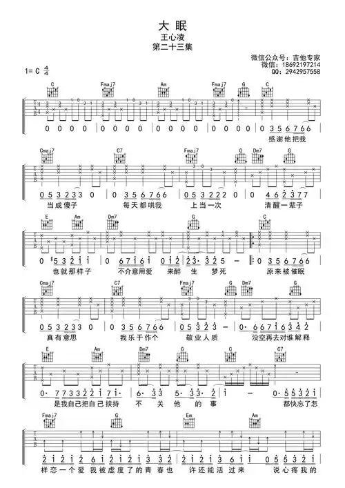 王心凌 大眠 c调完美版吉他谱c调六线吉他谱-虫虫吉他谱免费下载