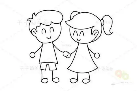 然后画出一个小女孩和小男孩手牵手.