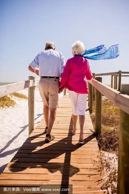 老年夫妇手牵手漫步热带海滩手牵手的幸福家庭手牵手的幸福夫妻幸福的