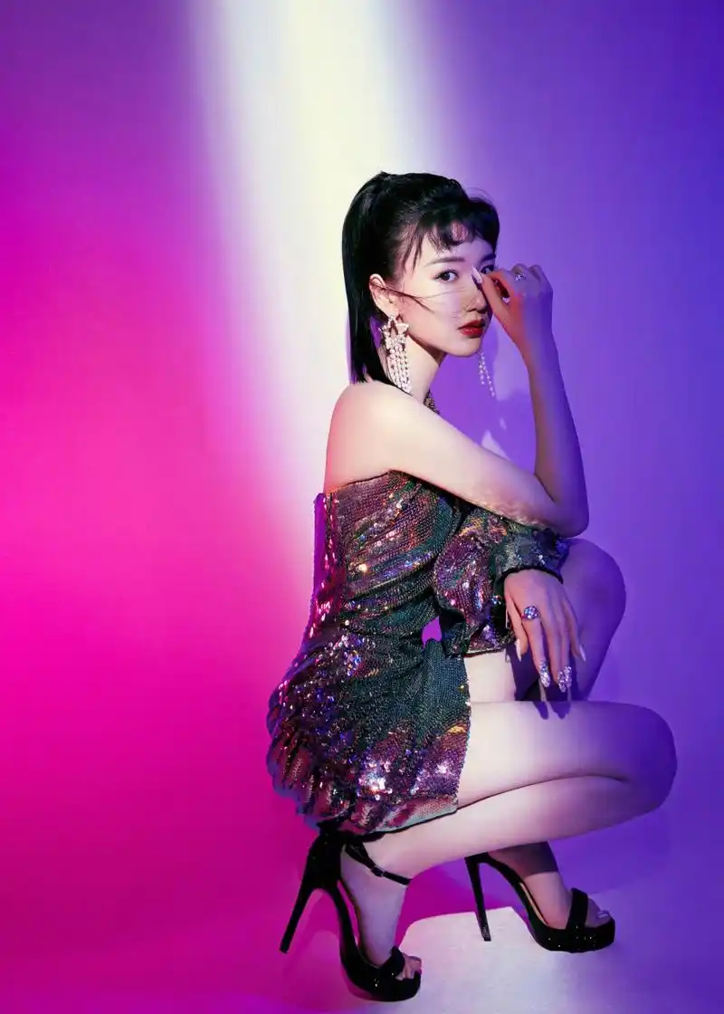 的不对称设计本就相当吸睛,毛晓彤选择了简约的黑色一字带高跟鞋,再用