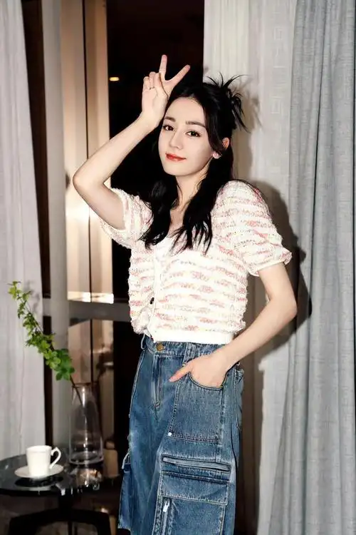 迪丽热巴的私服穿搭看起来更随意,日常的发型也以