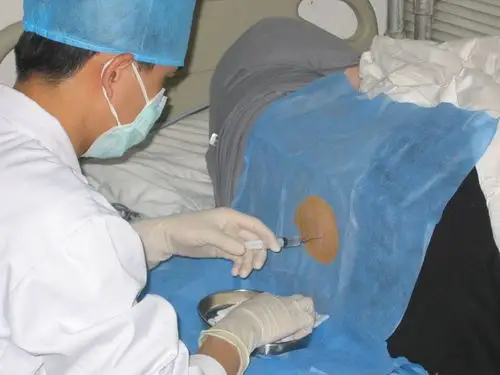 穿刺:用左手固定穿刺点皮肤,右手持穿刺针以垂直背部的方向缓慢刺入