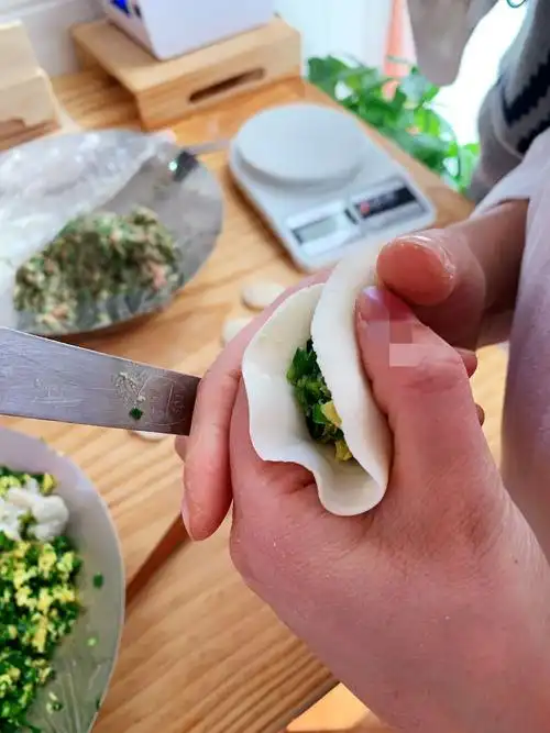 下一步开始包水饺了(皮是买来预备好的)我包的水饺是不是很像元宝呢