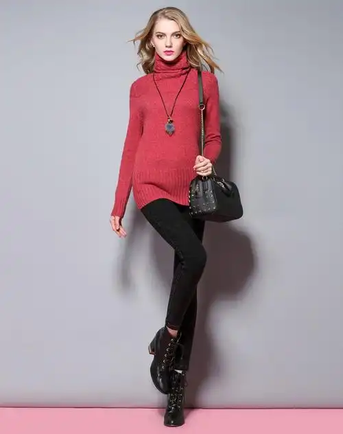 豆沙色高领竖条纹羊毛衫