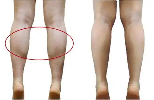 用两手手指按压住小腿肚中央部分,往左右两边掰动,分拨小腿肚肌肉.