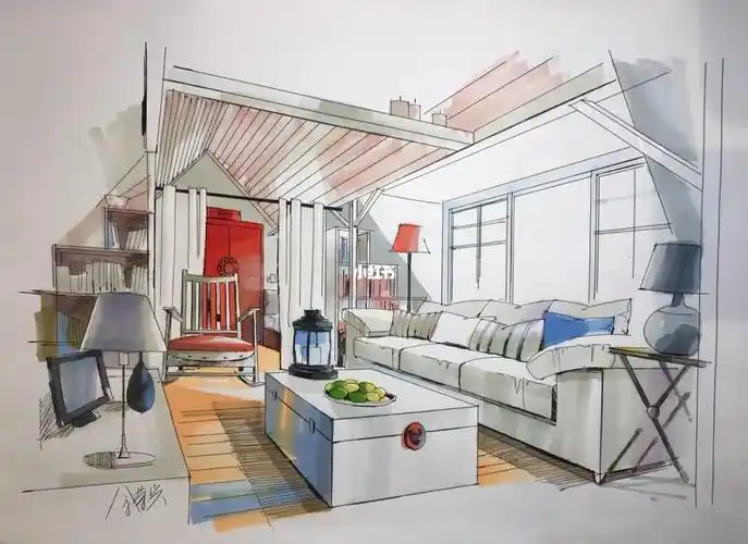 家居客厅马克笔手绘效果图片