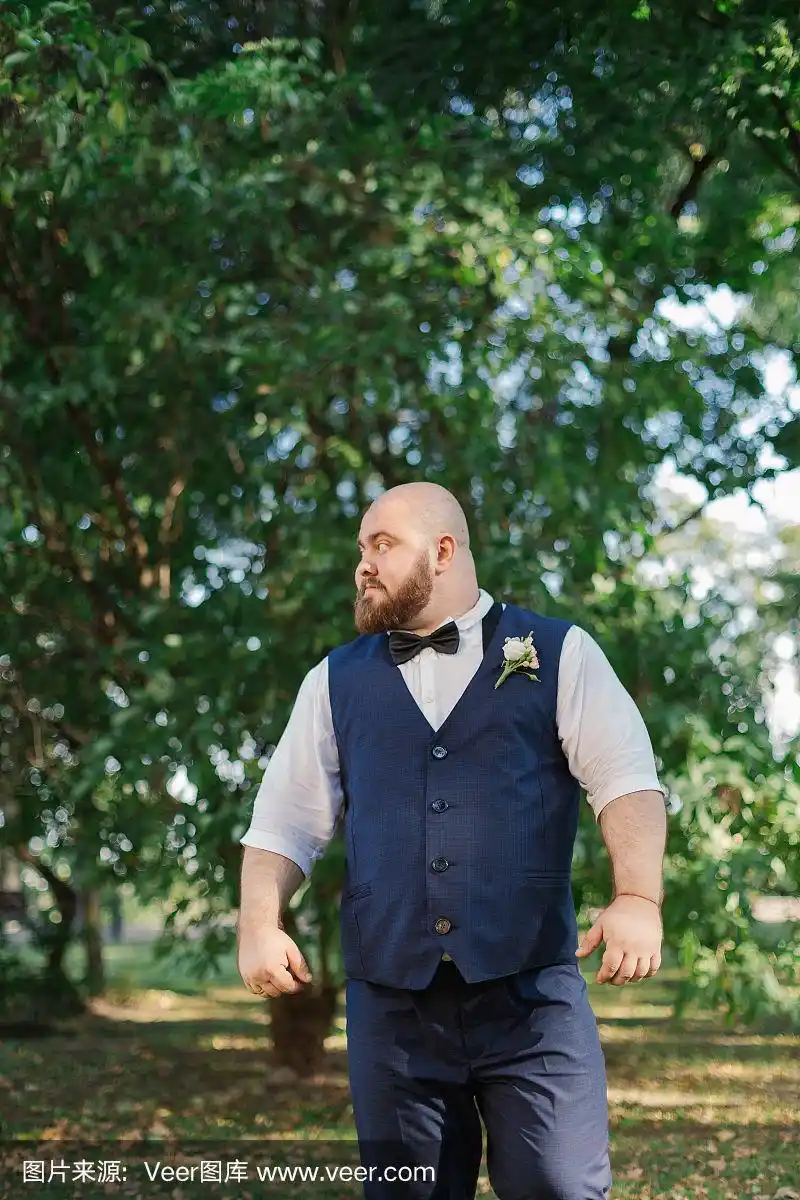 公园里留着胡子的胖新郎