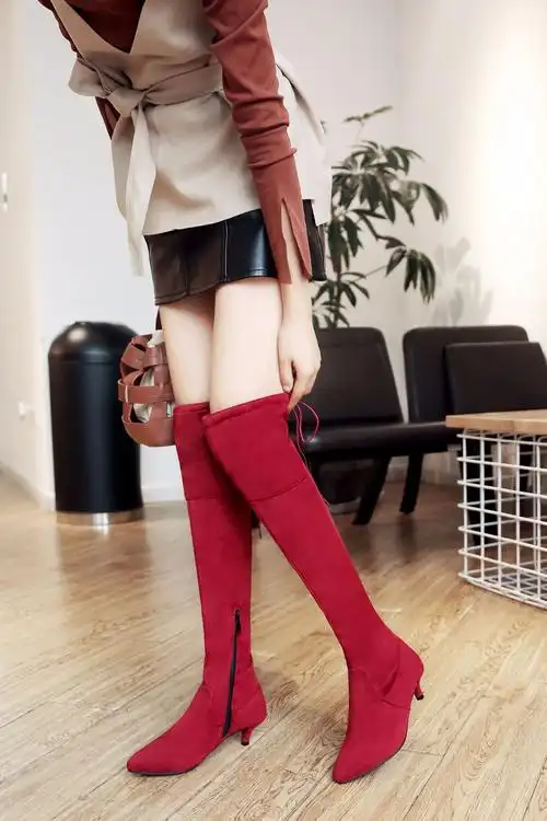 2018年秋冬季5cm粗中跟圆头过膝大红色绒面长筒靴大小码简约女靴