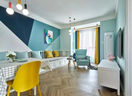 横向拼色:墙面上班部分和下半部分刷不同颜色的乳胶漆,做分色设计比