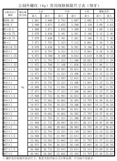 螺纹规格表