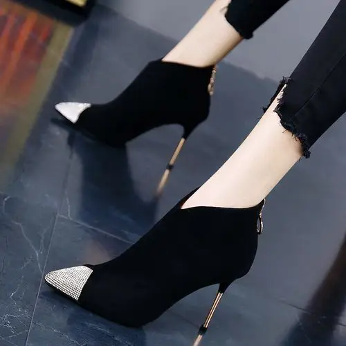 时尚女人高跟鞋微露脚趾缝的黑色尖头高跟鞋中后空设计高跟鞋搭配珍珠