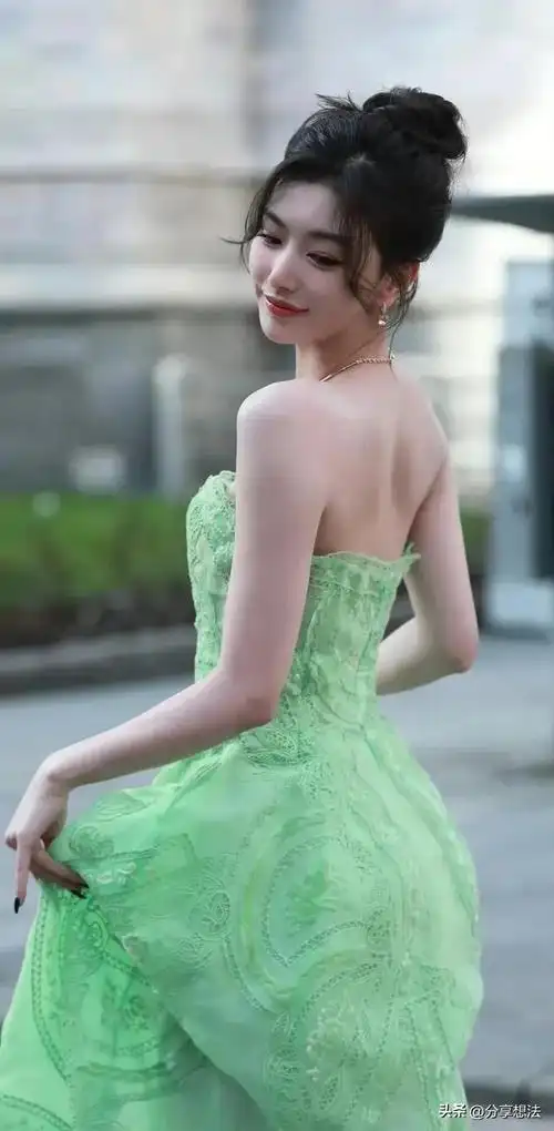 孔雪儿绿色露脐连衣裙时尚写真,颜值完美五官精致,身材修长婀娜_气质